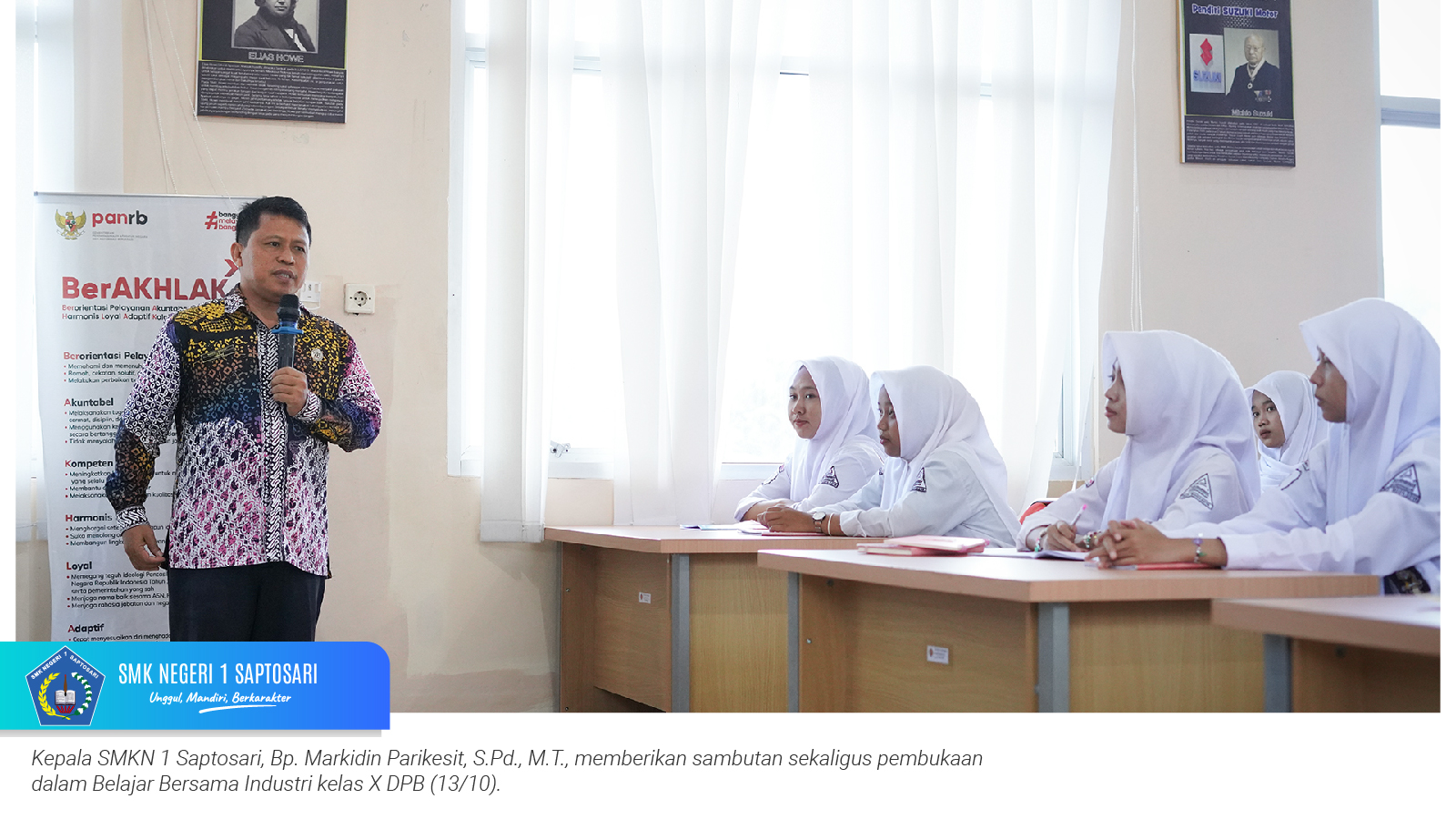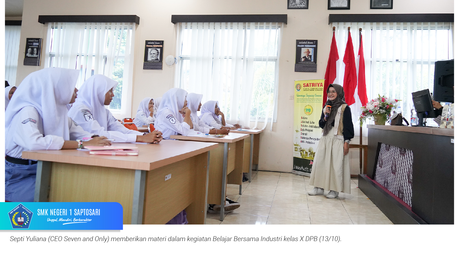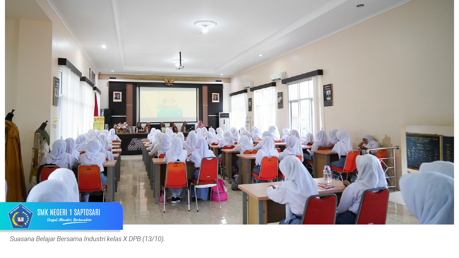 www.smkn1saptosari.sch.id (GUNUNGKIDUL). SMKN 1 Saptosari menggelar kegiatan Guru Tamu bertajuk Belajar Bersama Industri yang diikuti oleh murid kelas X Konsentrasi Keahlian Desain dan Produksi Busana. Kegiatan ini berlangsung di Aula Sasana Amarta Skatusa pada Senin, 13 Oktober 2025, dengan menghadirkan narasumber dari para women CEO inspiratif.