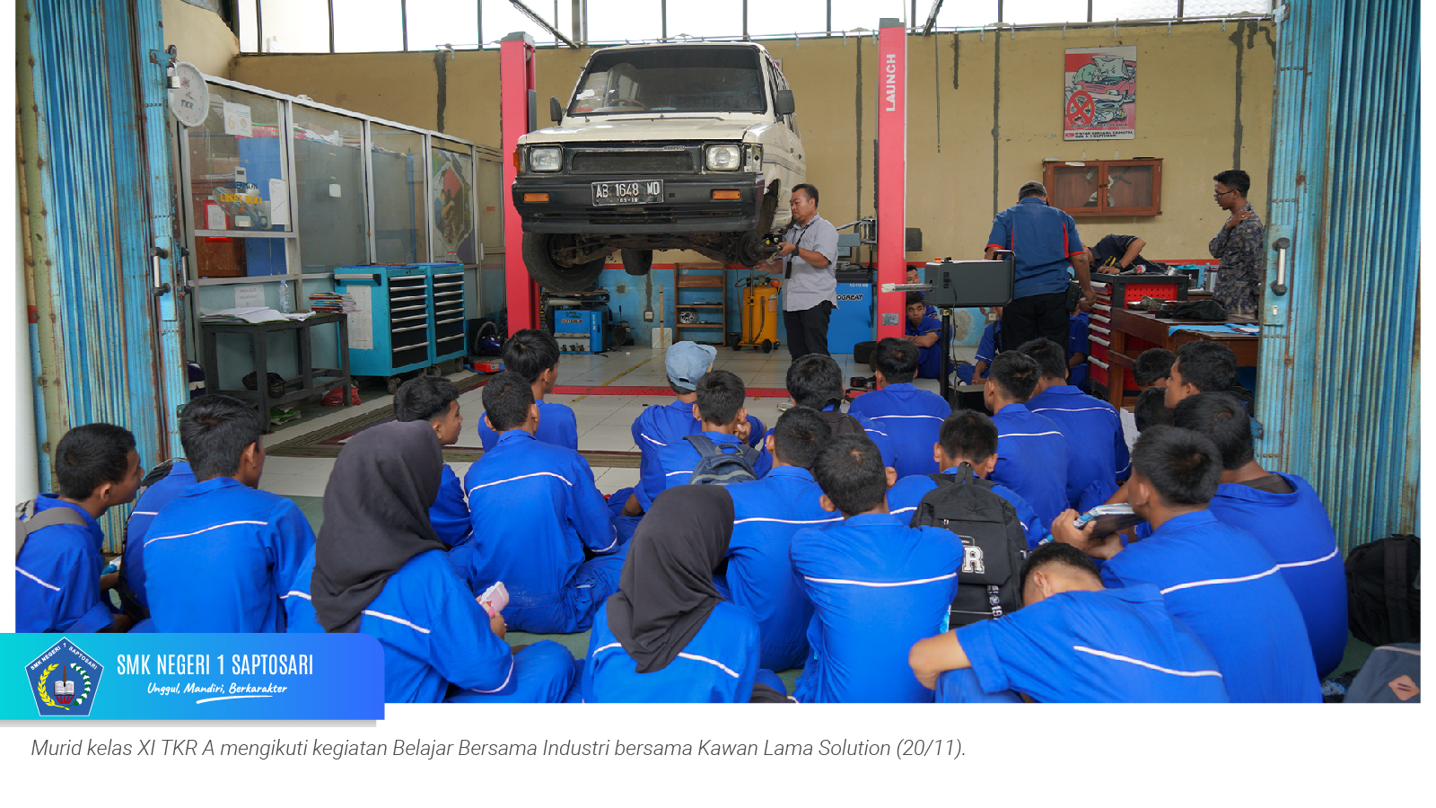 www.smkn1saptosari.sch.id (GUNUNGKIDUL). SMKN 1 Saptosari kembali menunjukkan komitmennya dalam menjaga relevansi pembelajaran dengan kebutuhan dunia industri. Upaya tersebut diwujudkan melalui kegiatan Belajar Bersama Industri yang digelar pada Kamis, 20 November 2025, bertempat di Bengkel TKR SKATUSA. Kegiatan ini diikuti oleh murid kelas XI Konsentrasi Keahlian Teknik Kendaraan Ringan A.