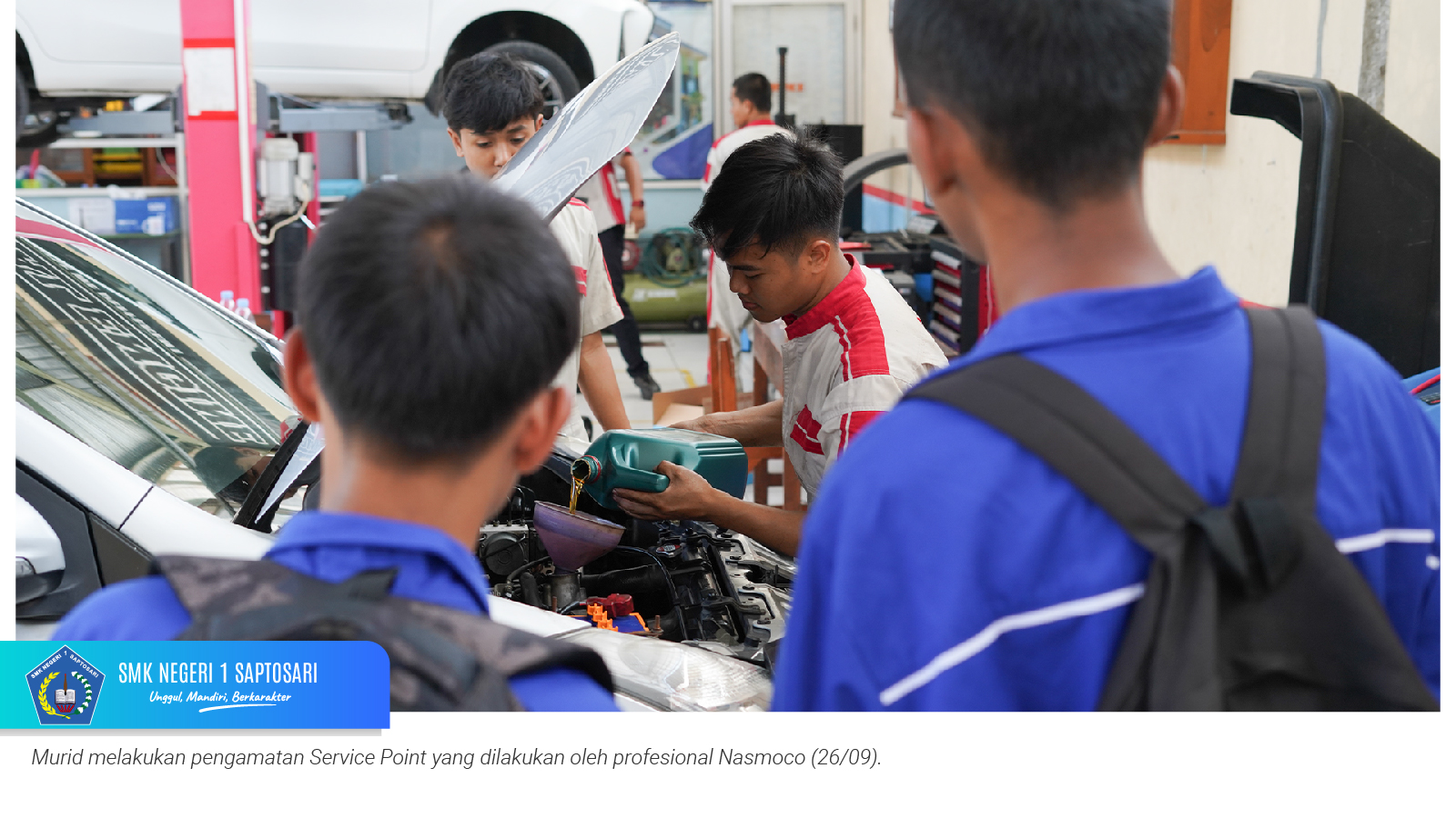 Kegiatan kedua adalah Service Point untuk kendaraan bermesin bensin yang terbuka bagi masyarakat umum di sekitar SMKN 1 Saptosari. Layanan ini ditangani langsung oleh teknisi ahli dari Nasmoco dengan berbagai paket perawatan, mulai dari servis berkala, tune up, ganti oli, gurah mesin, penggantian gasket, hingga perawatan lainnya.