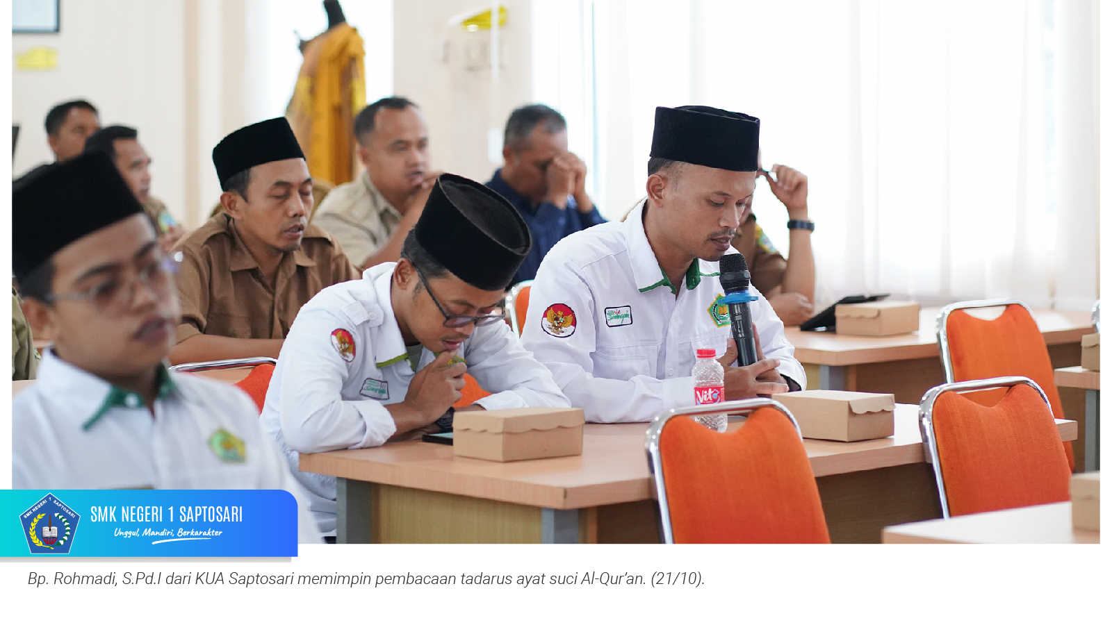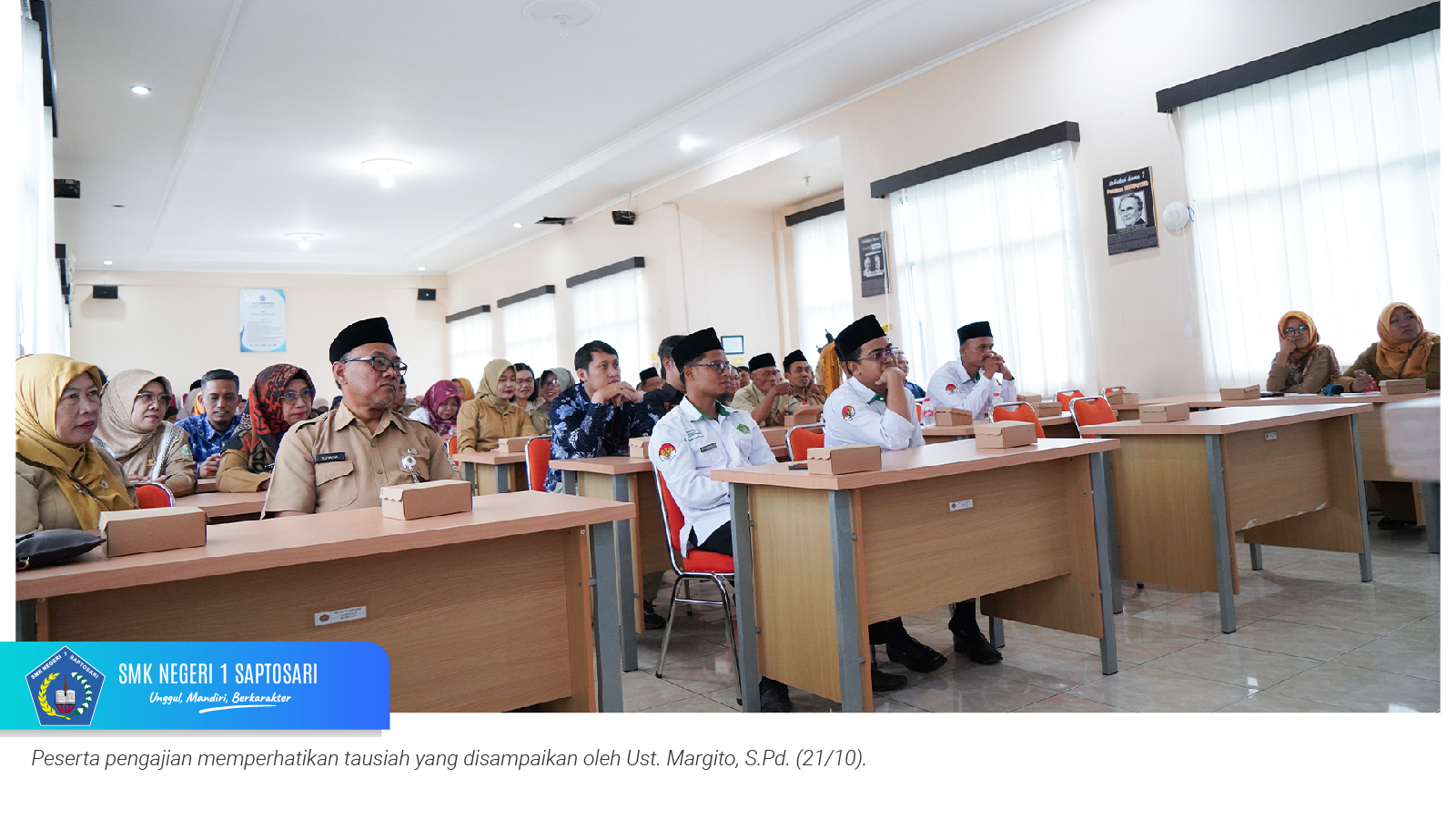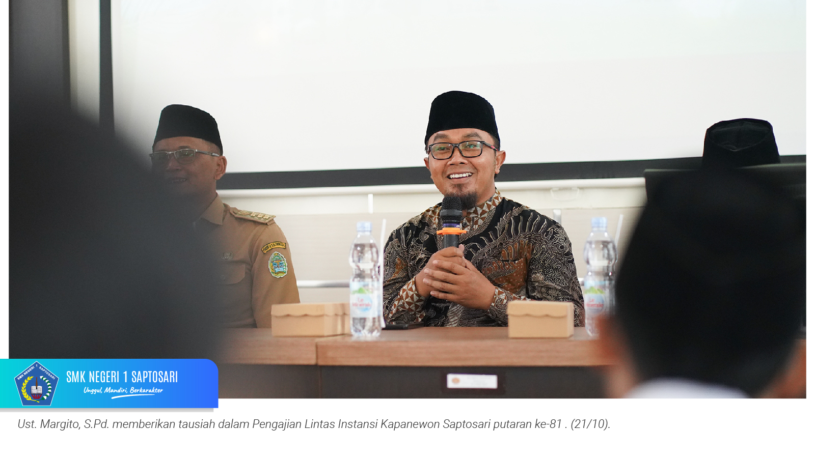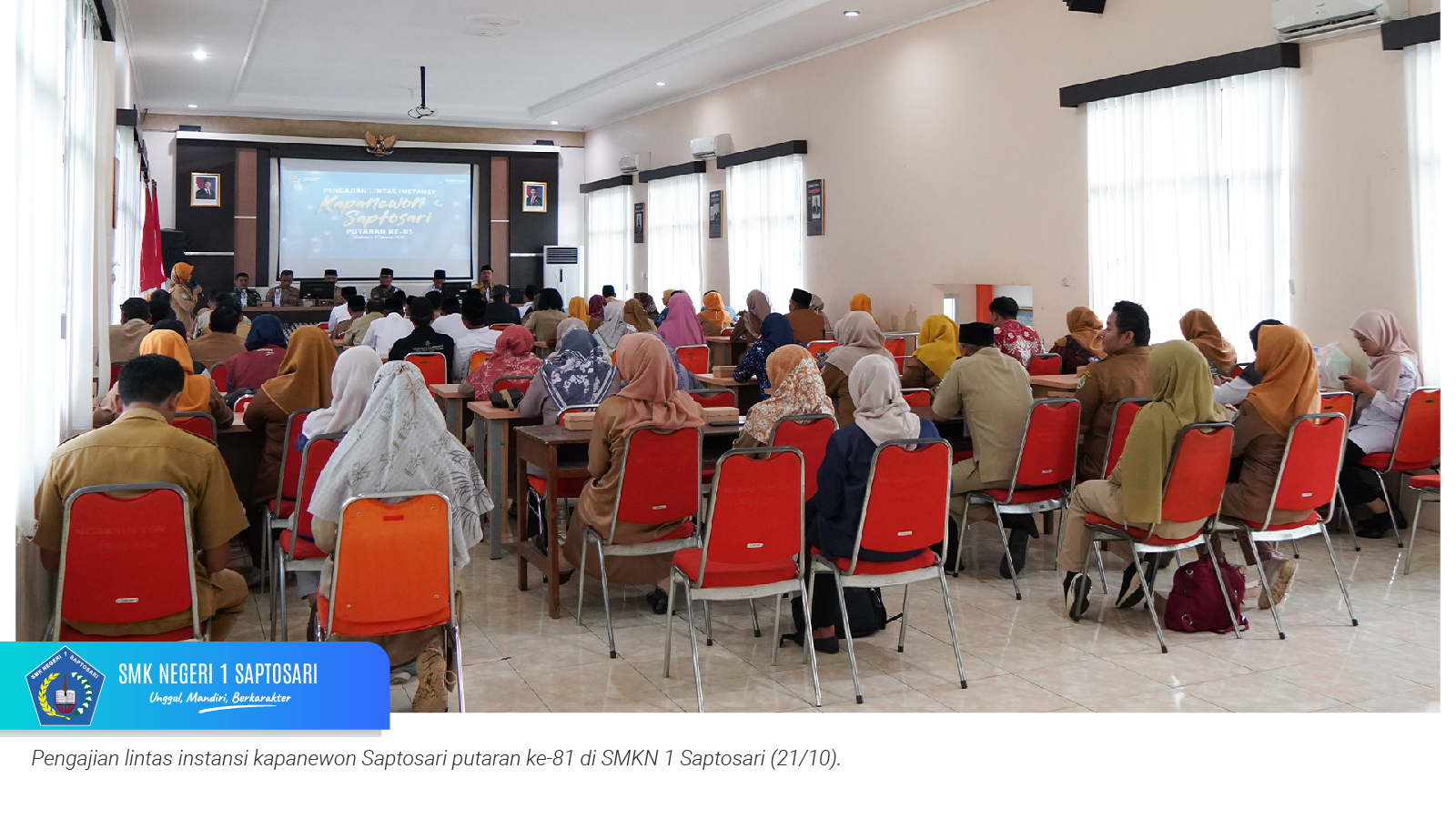 www.smkn1saptosari.sch.id (GUNUNGKIDUL). SMKN 1 Saptosari kembali menjadi tuan rumah kegiatan Pengajian Lintas Instansi Kapanewon Saptosari putaran ke-81 yang diselenggarakan pada Selasa, 21 Oktober 2025, di Aula Sasana Amarta SKATUSA. Kegiatan ini dihadiri oleh Forkompinkap Saptosari, serta perwakilan dari berbagai instansi, dinas, kalurahan, dan lembaga se-Kapanewon Saptosari.