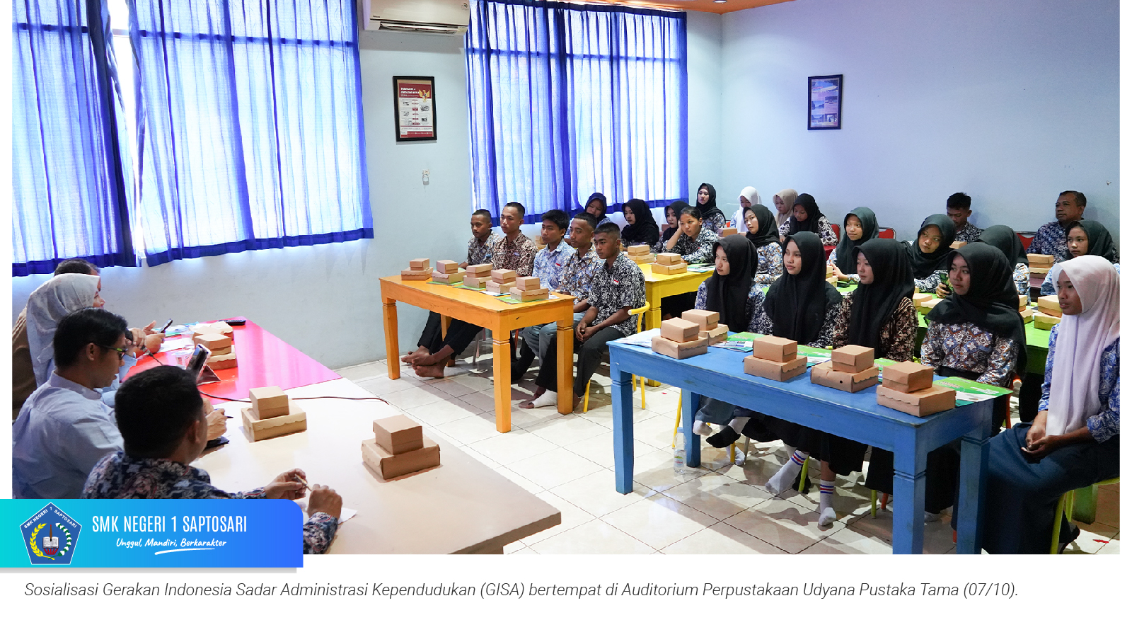 www.smkn1saptosari.sch.id (GUNUNGKIDUL). Dalam upaya meningkatkan pemahaman dan kesadaran masyarakat terhadap pentingnya administrasi kependudukan (adminduk), Dinas Kependudukan dan Pencatatan Sipil (Disdukcapil) Kabupaten Gunungkidul bekerja sama dengan SMKN 1 Saptosari menggelar kegiatan Sosialisasi Gerakan Indonesia Sadar Administrasi Kependudukan (GISA), Selasa (7/10/2025).