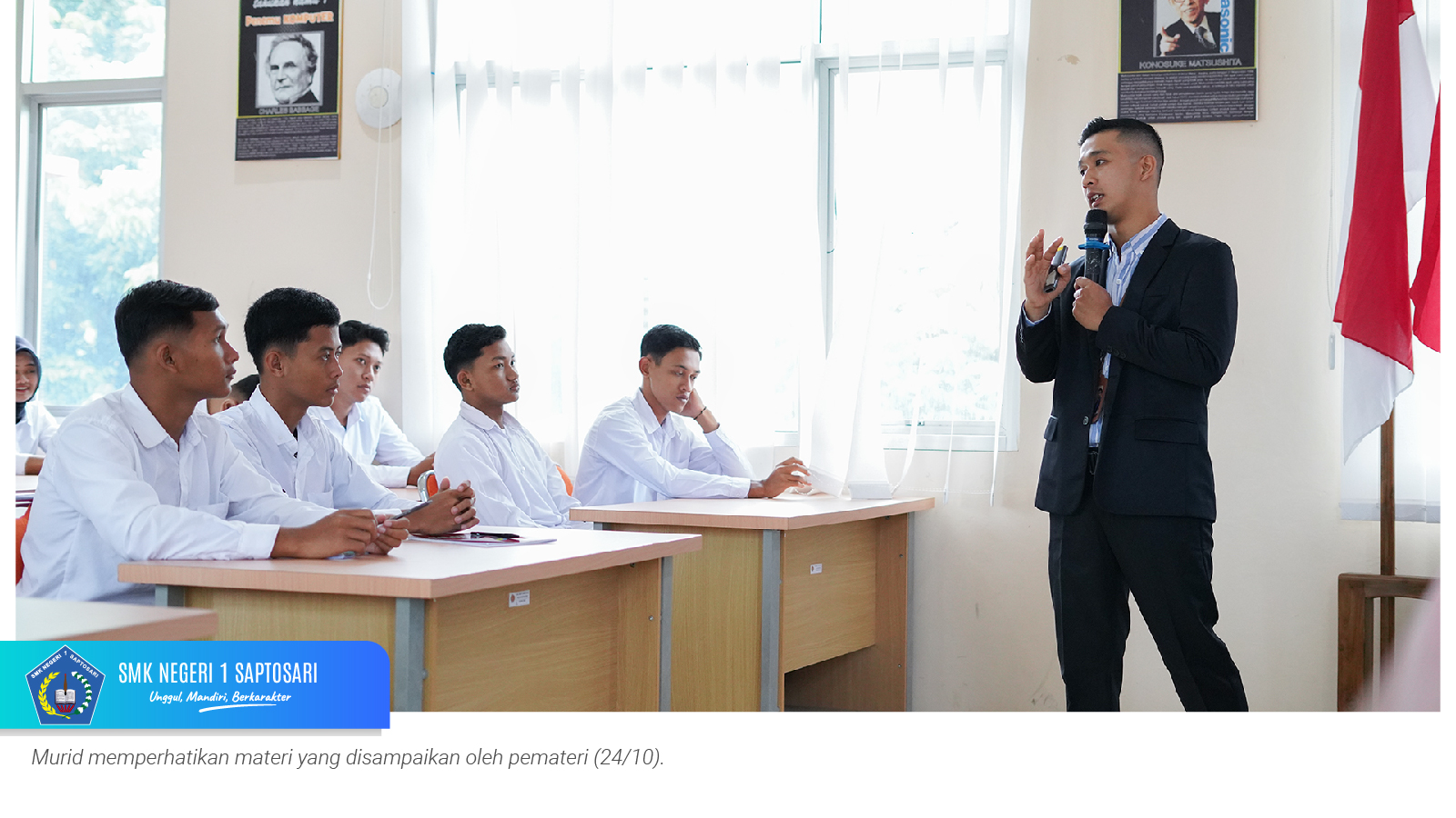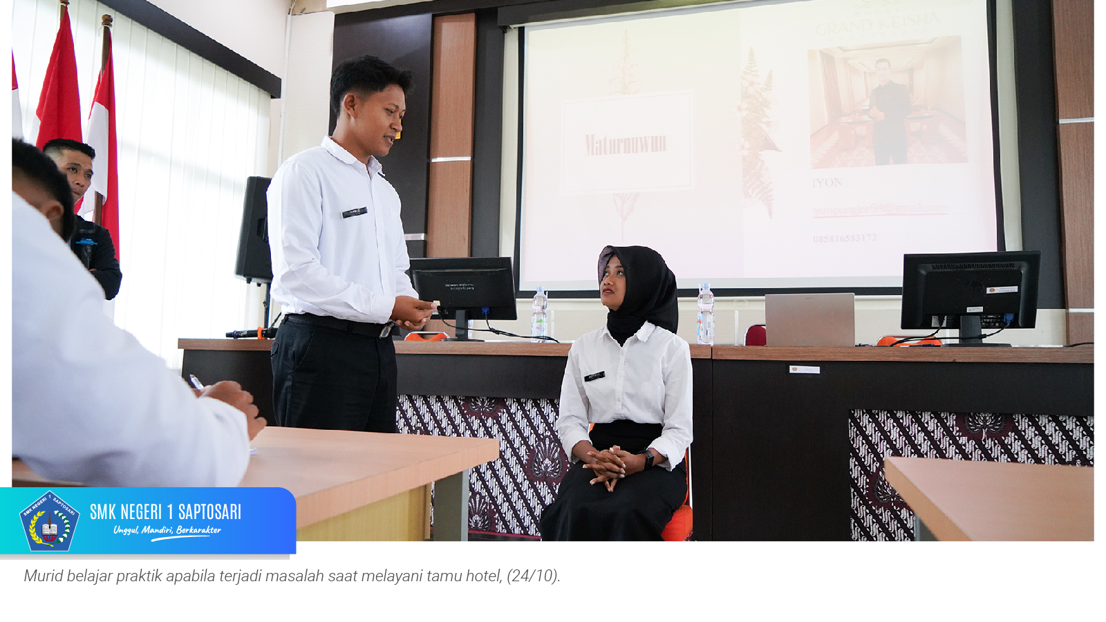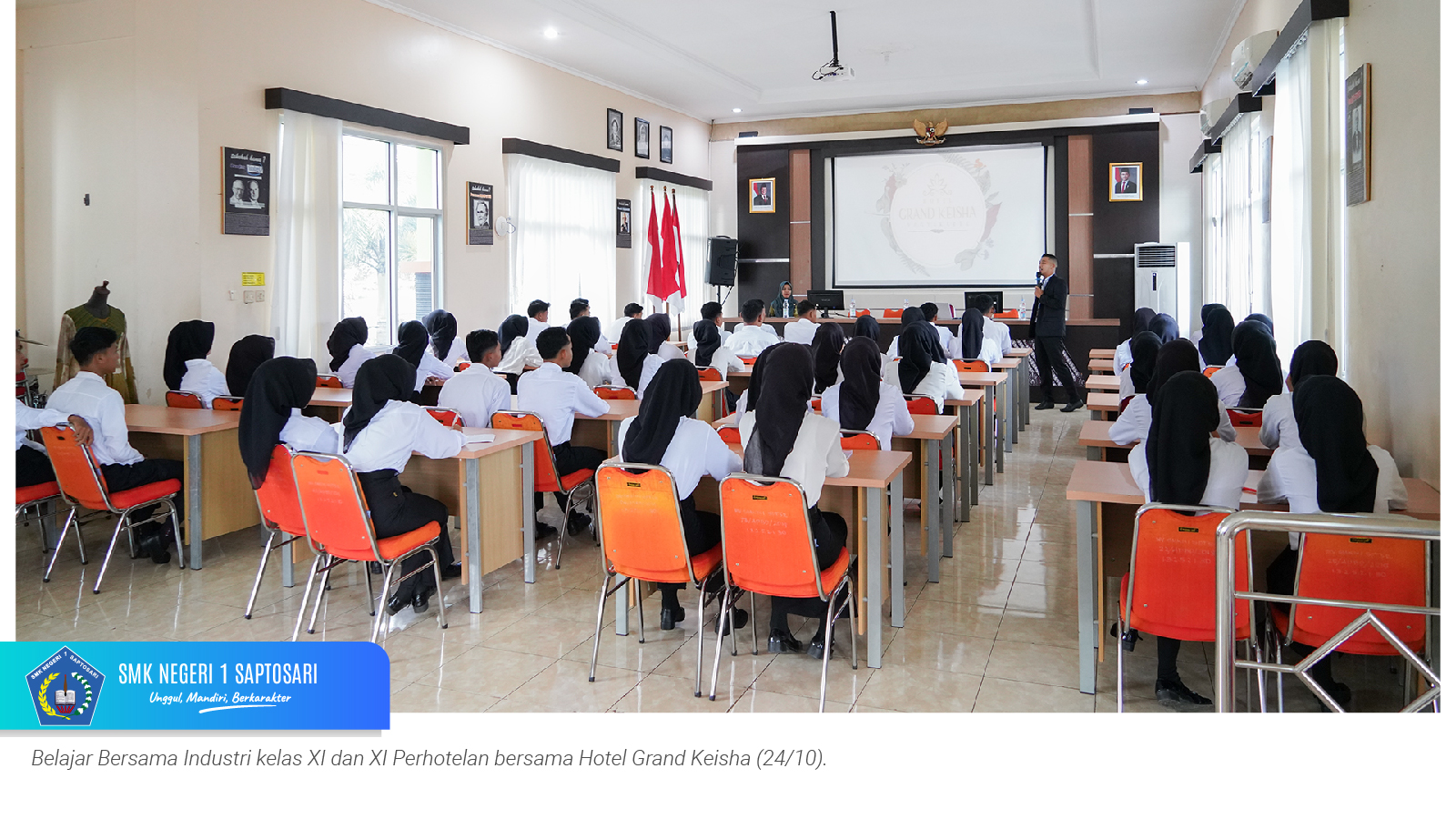 www.smkn1saptosari.sch.id (GUNUNGKIDUL). Dalam upaya memperkuat program link and match antara dunia industri dan dunia pendidikan, SMKN 1 Saptosari kembali melaksanakan kegiatan bertajuk Belajar Bersama Industri dengan menghadirkan narasumber dari Hotel Grand Keisha Yogyakarta, Bapak Supriyono, selaku Banquet Operation Manager.