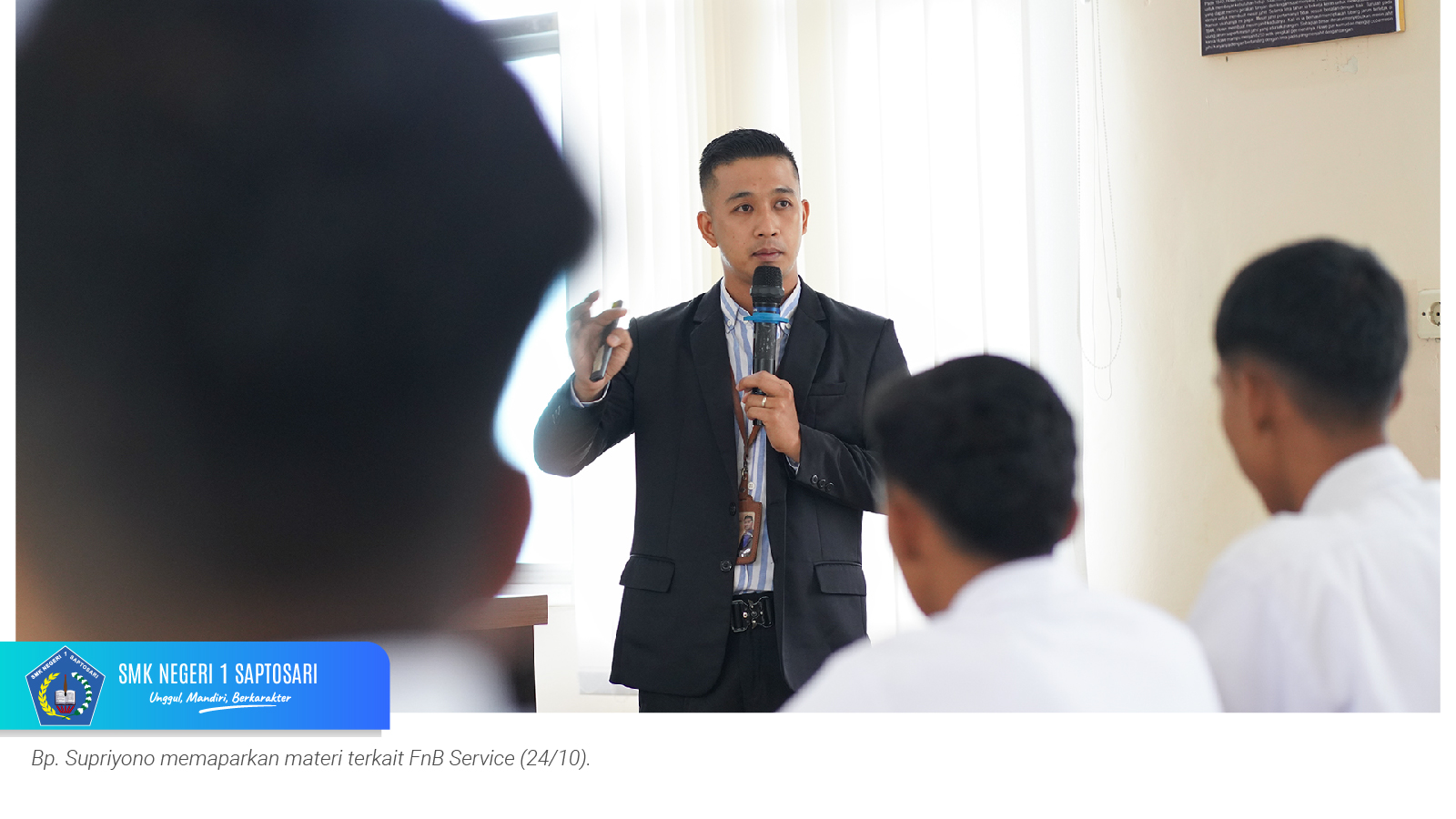 Pada sesi inti, Bapak Supriyono menyampaikan materi mengenai penerapan standar pelayanan F&B di hotel berbintang empat. Ia juga membagikan berbagai pengalaman profesionalnya di dunia perhotelan untuk memberikan gambaran nyata kepada para murid mengenai tantangan dan etika kerja di industri tersebut.
