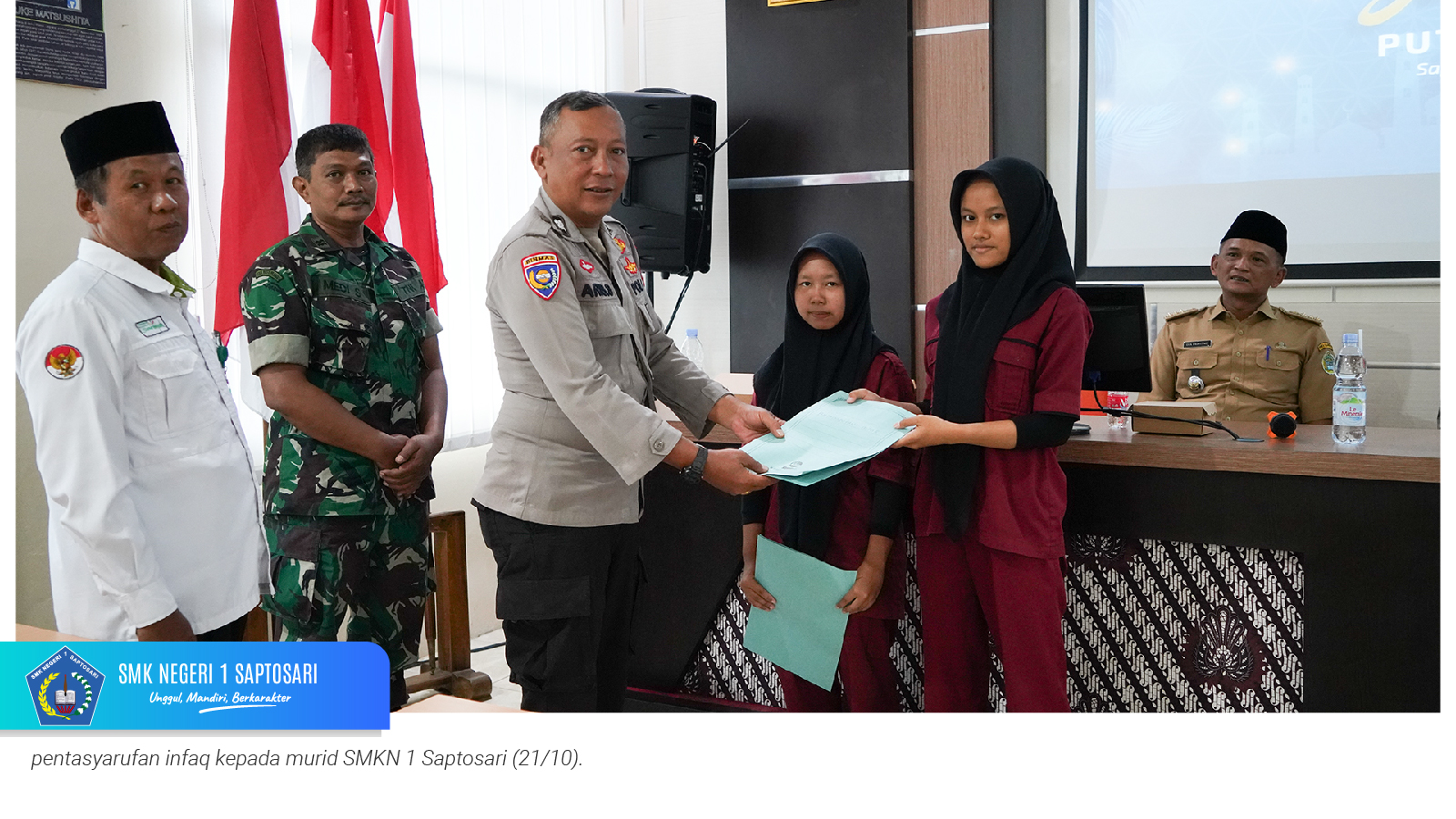 Menjelang akhir acara, dilakukan pentasyarufan infaq yang terkumpul dari kegiatan pengajian lintas instansi. Pada kesempatan kali ini, infaq disalurkan kepada dua siswa SMKN 1 Saptosari, yakni Salsabila (XII TAV A) dan Stiva Cindyka Aulia (XII APHP B).