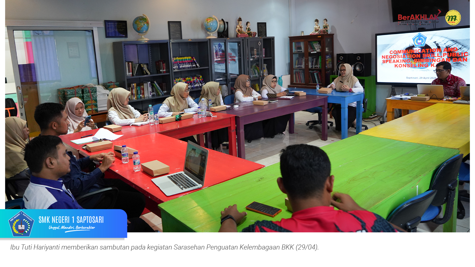 www.smkn1saptosari.sch.id (GUNUNGKIDUL). SMKN 1 Saptosari menyelenggarakan kegiatan Sarasehan Penguatan Kelembagaan Bursa Kerja Khusus (BKK) yang diikuti oleh tim BKK Buana Mandiri serta guru normatif adaptif. Kegiatan berlangsung di Ruang Audio Video Perpustakaan Udyana Pustaka Tama SKATUSA, Rabu (29/4).