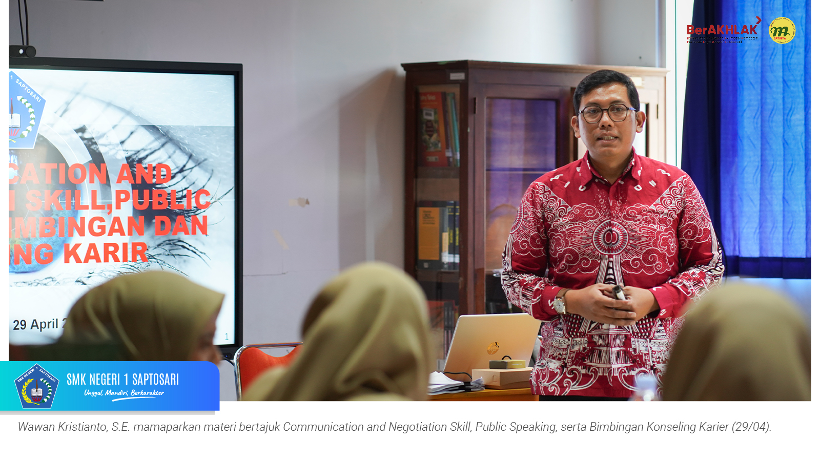 Memasuki sesi inti, bapak Wawan Kristianto memaparkan materi bertajuk Communication and Negotiation Skill, Public Speaking, serta Bimbingan Konseling Karir. Beliau menekankan bahwa komunikasi efektif menjadi fondasi utama dalam membangun hubungan, baik di lingkungan pendidikan maupun dunia kerja.