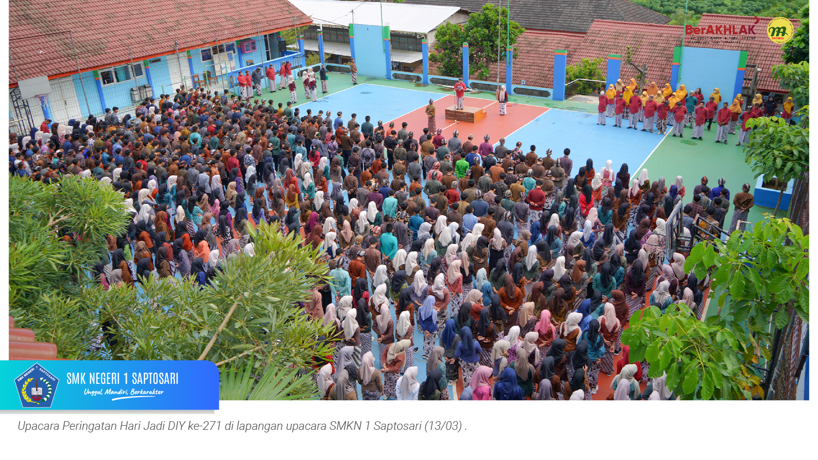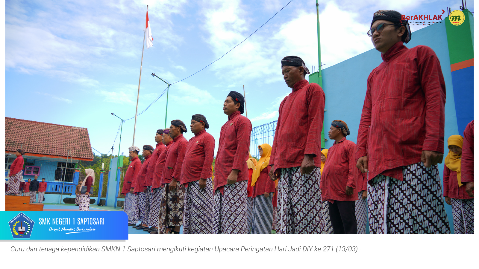 www.smkn1saptosari.sch.id (GUNUNGKIDUL). SMKN 1 Saptosari melaksanakan upacara peringatan Hari Jadi ke-271 Daerah Istimewa Yogyakarta pada Jumat Wage, 13 Maret 2026 di lapangan sekolah. Kegiatan ini diselenggarakan merujuk pada Surat Edaran Nomor 19 Tahun 2026 tentang Pedoman Peringatan Hari Jadi ke-271 Daerah Istimewa Yogyakarta Tahun 2026.