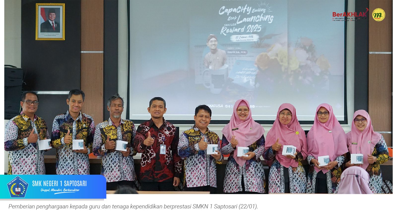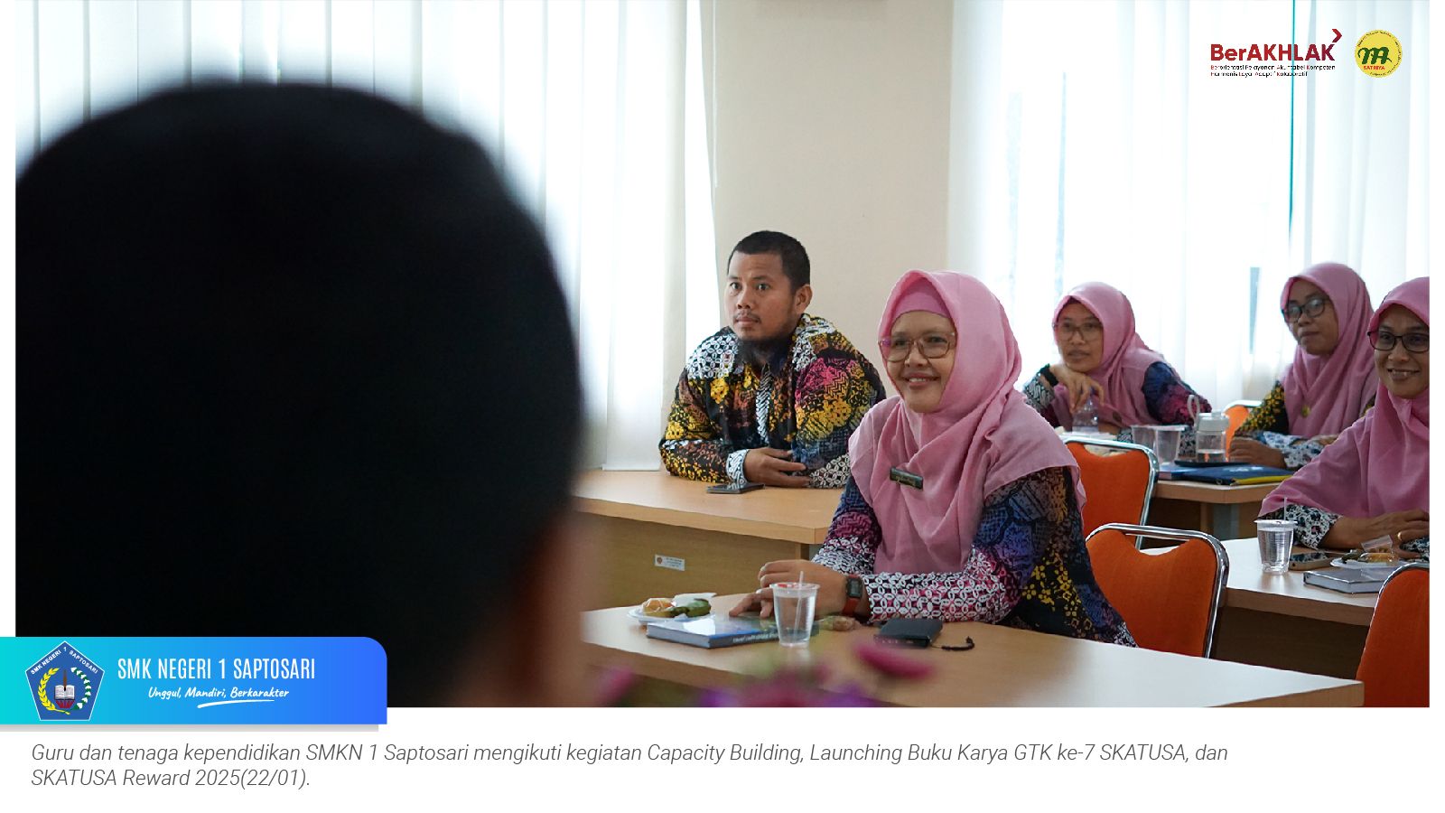 www.smkn1saptosari.sch.id (GUNUNGKIDUL). SMKN 1 Saptosari kembali meneguhkan komitmennya sebagai sekolah yang terus bertumbuh dan berkemajuan melalui tiga agenda besar yang diselenggarakan secara bersamaan, Kamis, 22 Januari 2026. Bertempat di Aula Sasana Amarta SKATUSA, kegiatan tersebut meliputi Capacity Building, Launching Buku Karya GTK ke-7 SKATUSA, serta SKATUSA Reward 2025 yang diikuti oleh seluruh guru dan tenaga kependidikan.