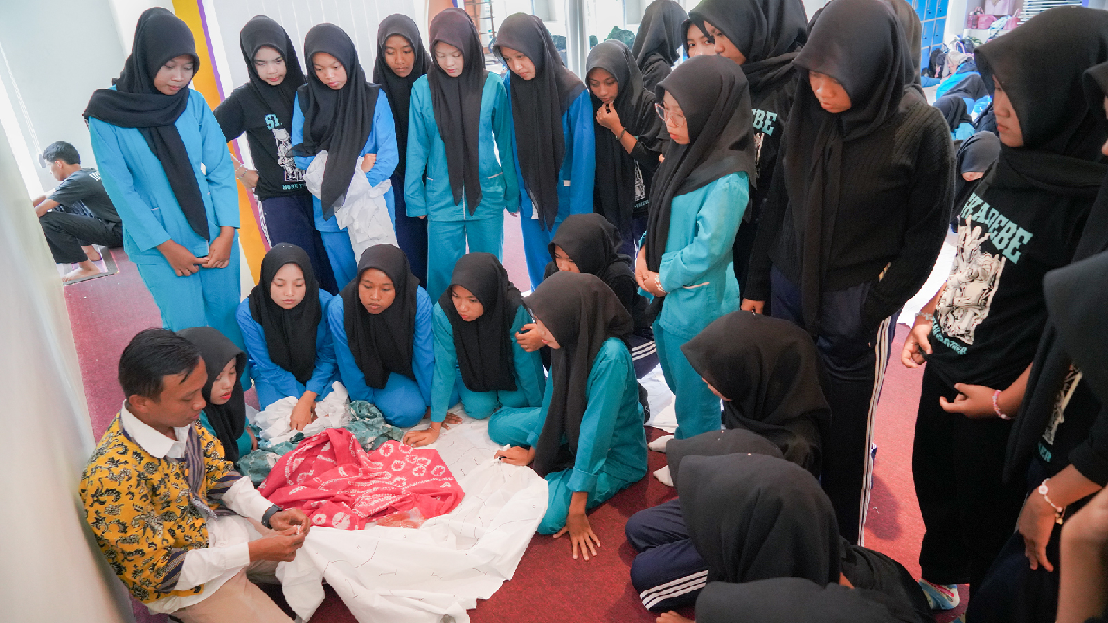 Setelah sesi materi, kegiatan dilanjutkan dengan praktik langsung pembuatan tie dye oleh para murid. Mereka tampak antusias mencoba berbagai teknik ikat dan eksplorasi warna untuk menghasilkan pola yang menarik dan estetik.