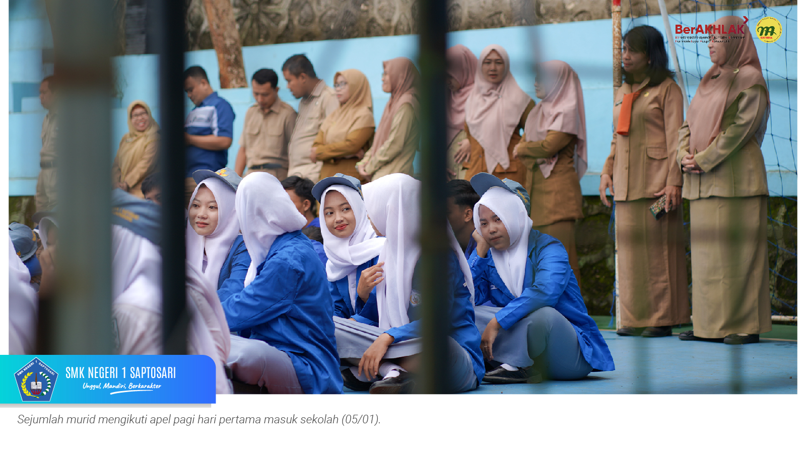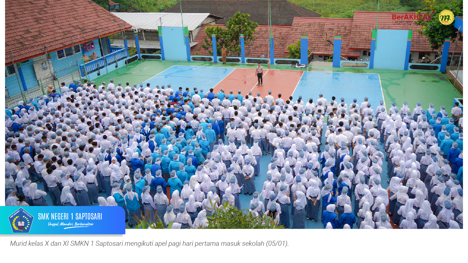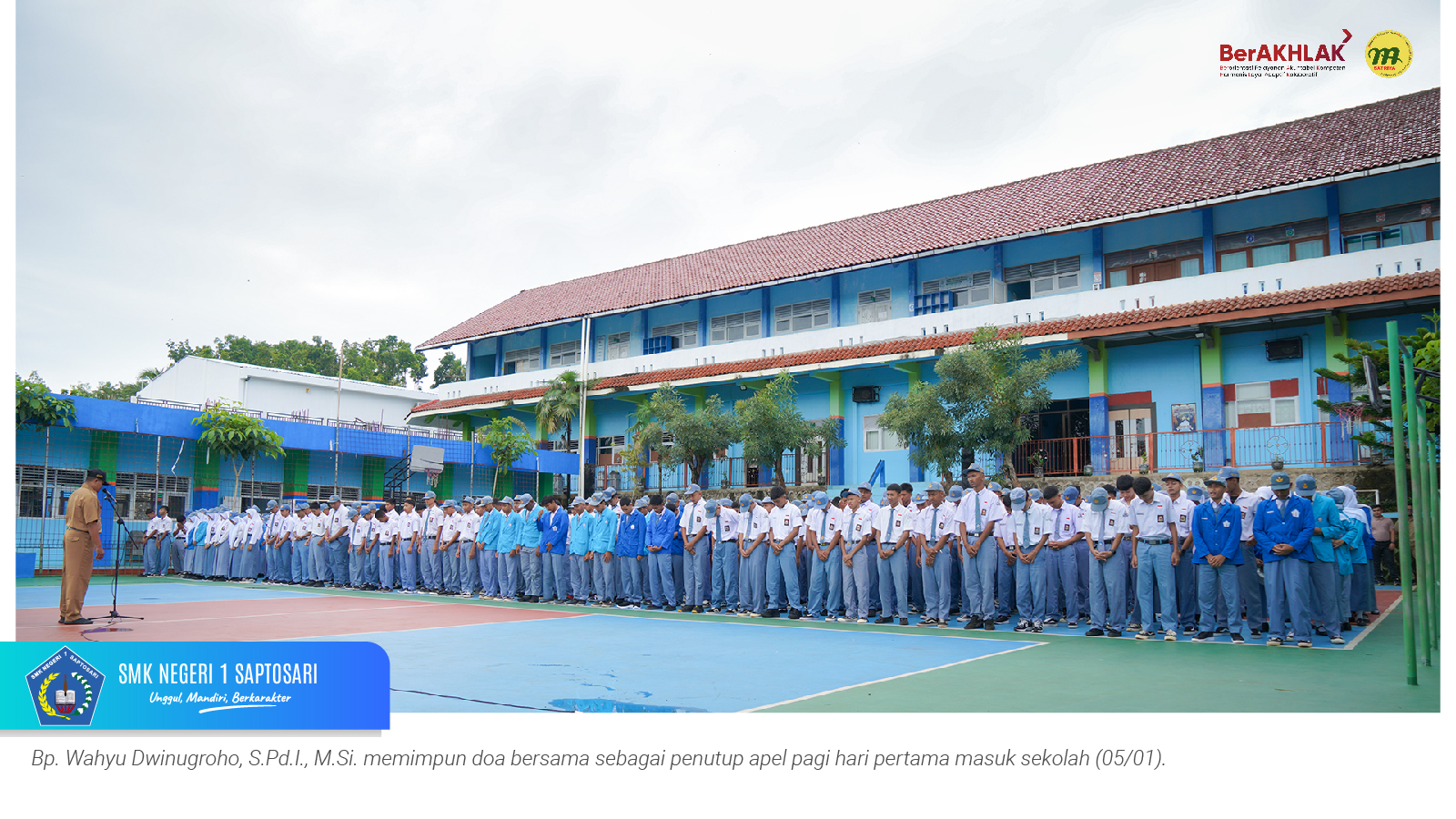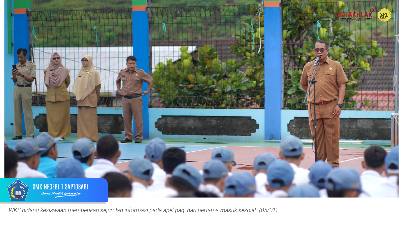 Apel pagi dipimpin oleh bapak Heri Mahmudi, S.Or. selaku pembina OSIS dan diikuti oleh seluruh wali kelas serta tenaga kependidikan. Pada kesempatan tersebut, Kepala SMKN 1 Saptosari, Bp. Markidin Parikesit, S.Pd., M.T., memberikan amanat kepada para murid.