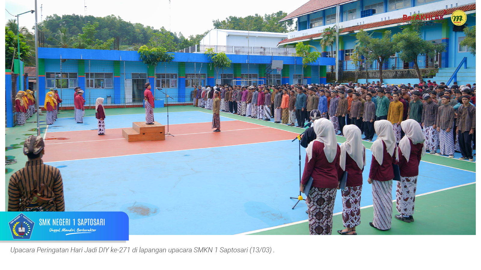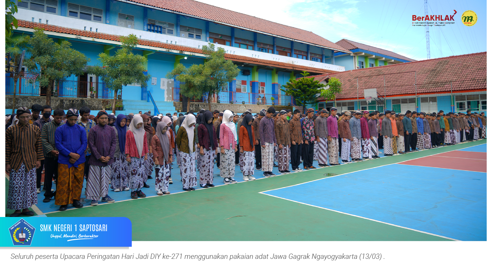 www.smkn1saptosari.sch.id (GUNUNGKIDUL). SMKN 1 Saptosari melaksanakan upacara peringatan Hari Jadi ke-271 Daerah Istimewa Yogyakarta pada Jumat Wage, 13 Maret 2026 di lapangan sekolah. Kegiatan ini diselenggarakan merujuk pada Surat Edaran Nomor 19 Tahun 2026 tentang Pedoman Peringatan Hari Jadi ke-271 Daerah Istimewa Yogyakarta Tahun 2026.