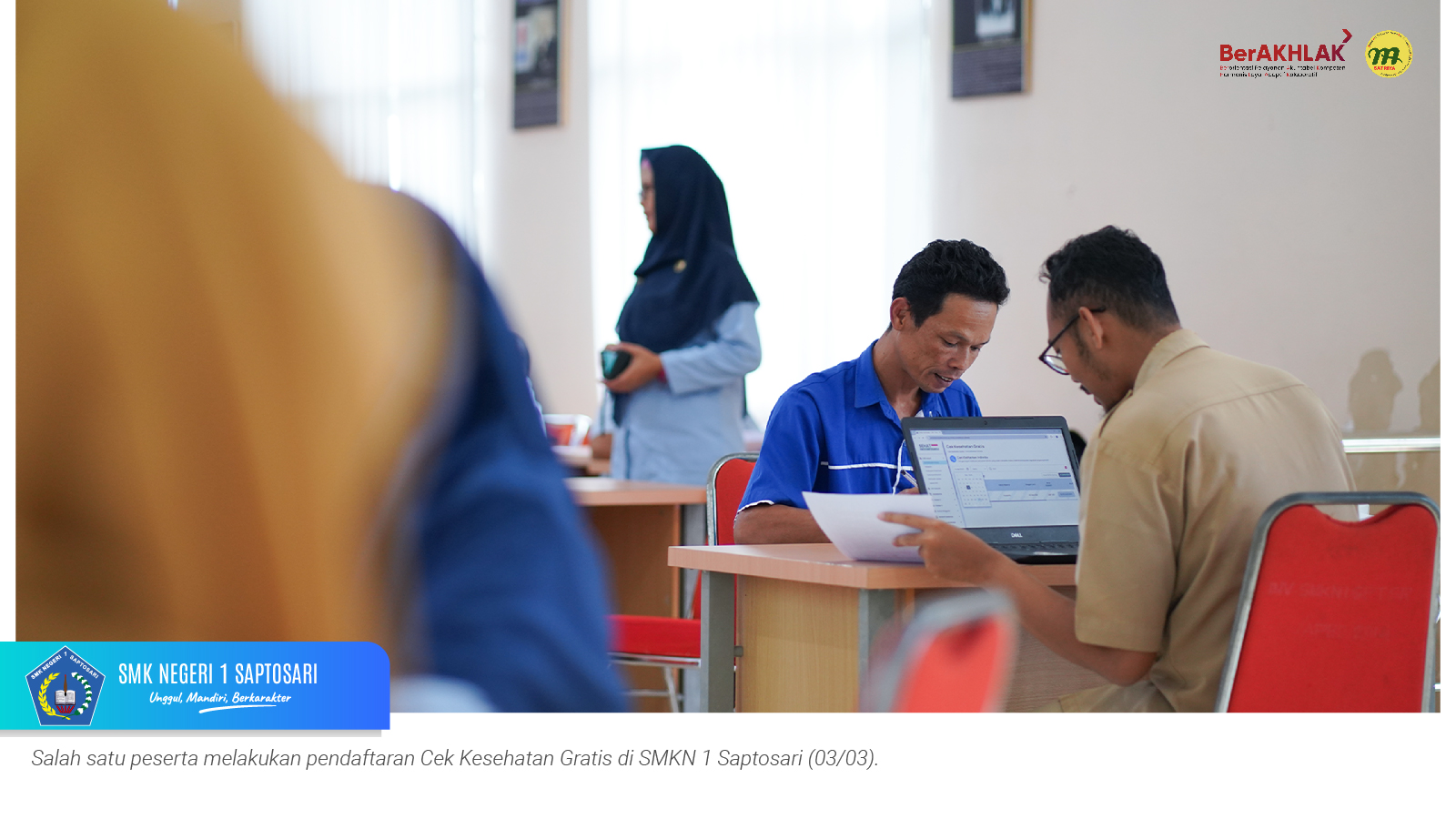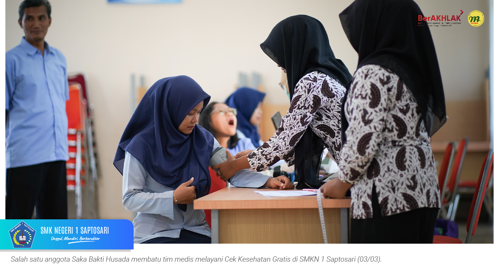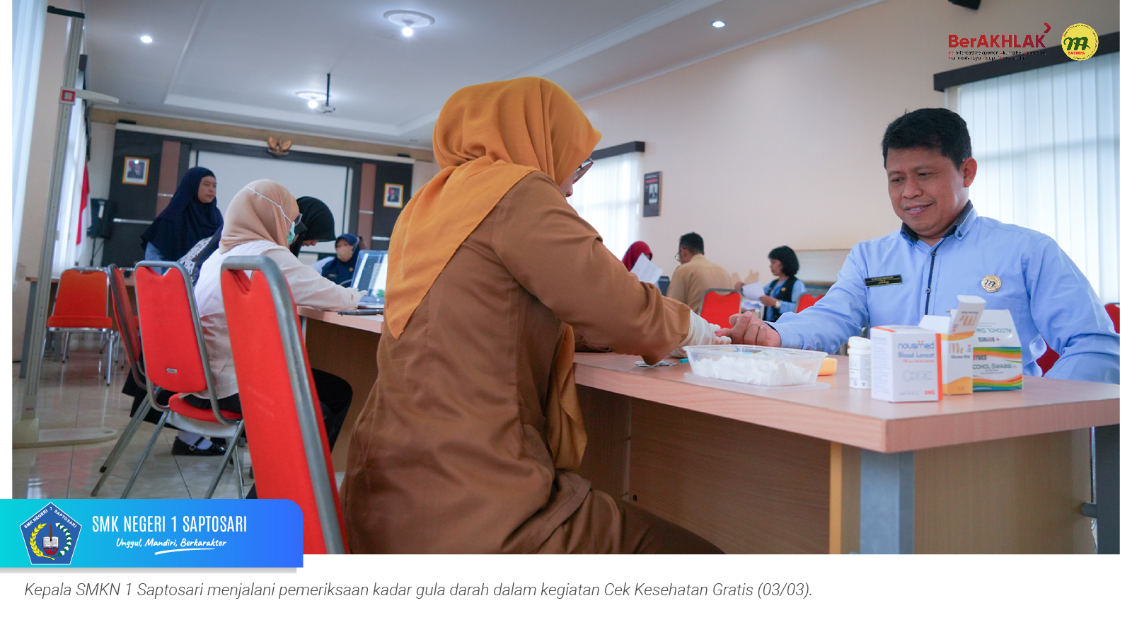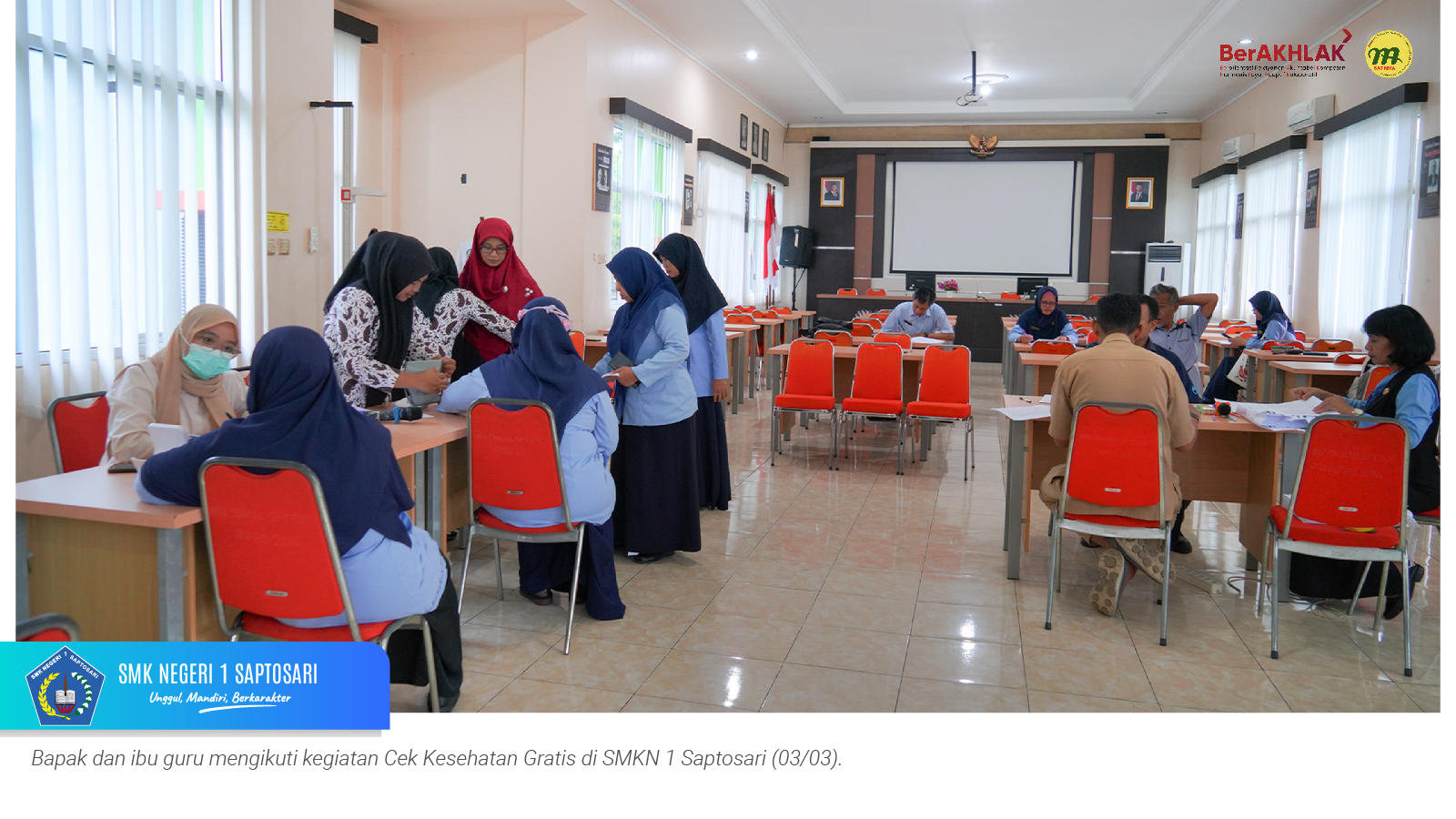 www.smkn1saptosari.sch.id (GUNUNGKIDUL). SMKN 1 Saptosari bekerja sama dengan UPT Puskesmas Saptosari menyelenggarakan kegiatan Pemeriksaan Cek Kesehatan Gratis (CKG) bagi seluruh guru dan tenaga kependidikan. Kegiatan tersebut berlangsung selama tiga hari, 3–5 Maret 2026, bertempat di Aula Sasana Amarta SKATUSA.