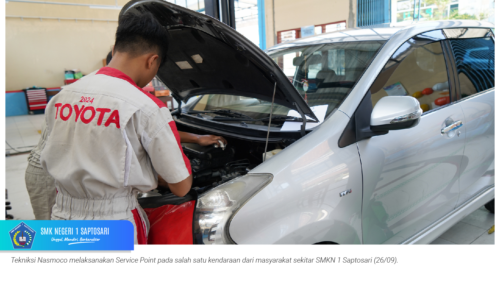 Kegiatan kedua adalah Service Point untuk kendaraan bermesin bensin yang terbuka bagi masyarakat umum di sekitar SMKN 1 Saptosari. Layanan ini ditangani langsung oleh teknisi ahli dari Nasmoco dengan berbagai paket perawatan, mulai dari servis berkala, tune up, ganti oli, gurah mesin, penggantian gasket, hingga perawatan lainnya.