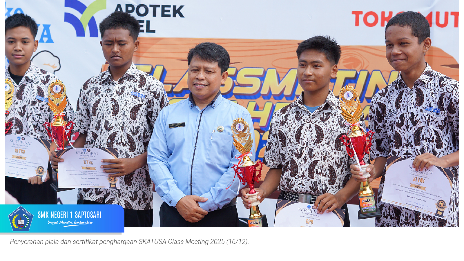 www.smkn1saptosari.sch.id (GUNUNGKIDUL). OSIS SMKN 1 Saptosari sukses menyelenggarakan SKATUSA Class Meeting 2025 yang berlangsung pada 10–15 Desember 2025. Kegiatan ini menjadi ajang penutup Semester Gasal sekaligus sarana pengembangan karakter, minat, dan bakat peserta didik di bidang olahraga.