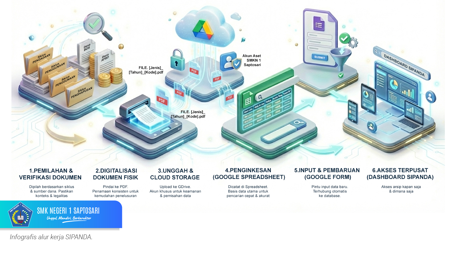 Dari wadah SARANG MERPATI inilah, pada Desember 2025, lahir sebuah inovasi dari tenaga kependidikan SMKN 1 Saptosari. Inovasi tersebut digagas oleh Ibu Evi Wulandari, A.Md., Penata Laksana Barang Terampil, yang memperkenalkan SIPANDA (Sistem Penatausahaan Aset Daerah).