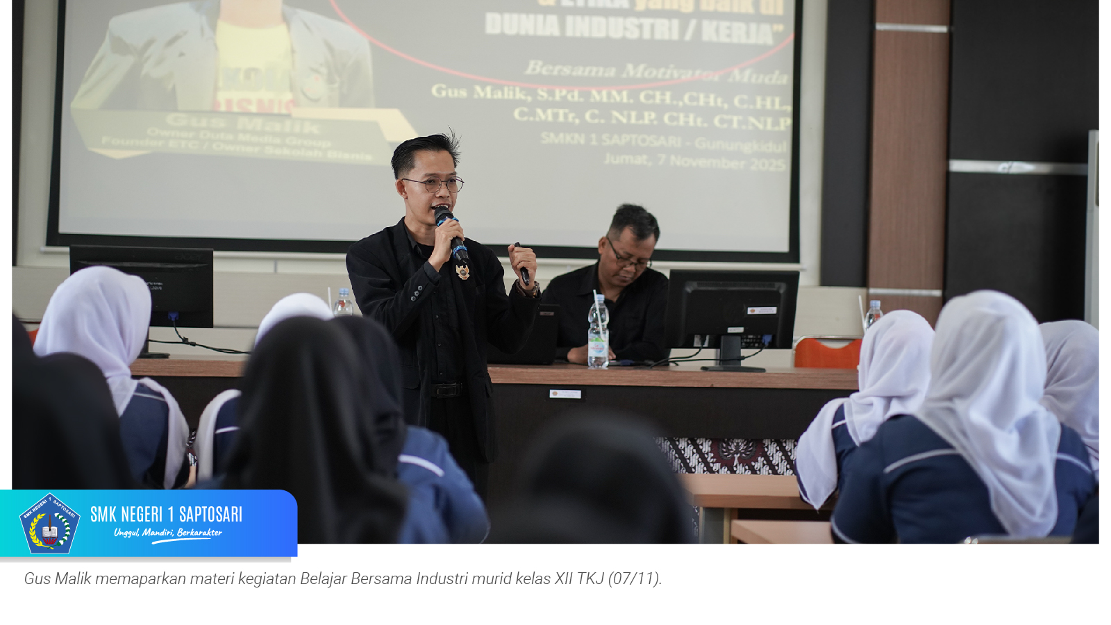www.smkn1saptosari.sch.id (GUNUNGKIDUL). Dalam upaya mempersiapkan murid agar siap menghadapi dunia kerja sekaligus sebagai bekal menjelang pelaksanaan Praktik Kerja Lapangan (PKL), SMKN 1 Saptosari menggelar kegiatan Belajar Bersama Industri bagi murid kelas XII Konsentrasi Keahlian Teknik Komputer dan Jaringan (TKJ), pada Jumat (7/11/2025).